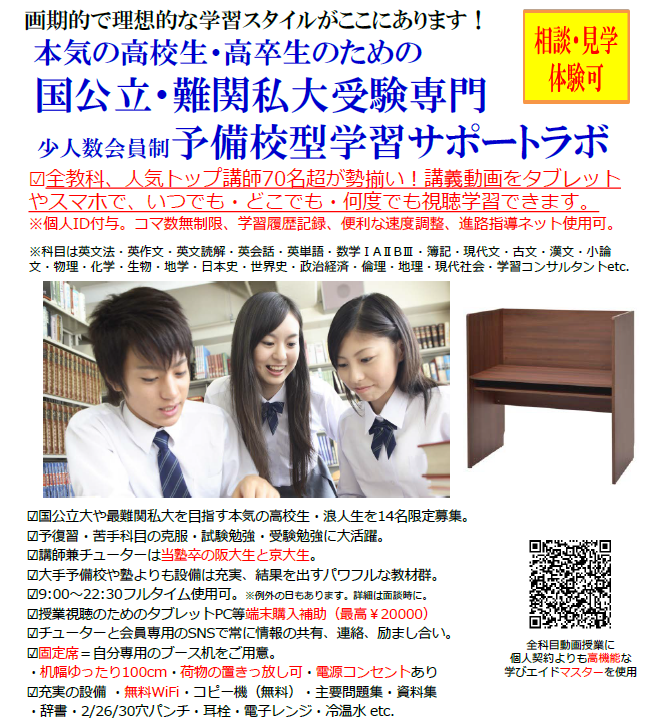 チューター兼講師は京大生、100cm幅自分専用固定ブース席(電源コンセント付)、無料Wi-Fi、コピー機使用無料、辞書、参考書完備。今ならタブレットPCプレゼント。