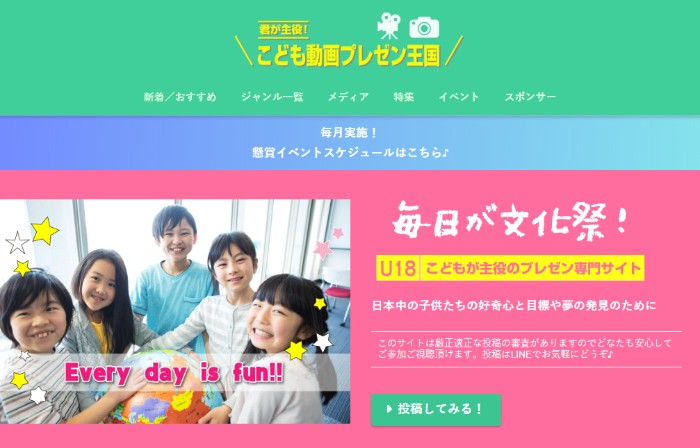 「こども動画プレゼン王国」は子どもたちが主役の投稿サイトです。(※保護者または所属組織が代理投稿。)