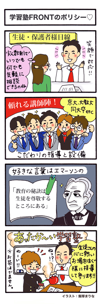 プロのイラストレーターの方に塾の宣伝4コマ漫画を描いていただきました。 流石ですね~♪味があっていい感じ!お願いしてよかったです^^ その①「学習塾FRONTのポリシー」です。 https://m.youtube.com/watch?v=8uNe7LGgn-0&t=1s →体験授業の...