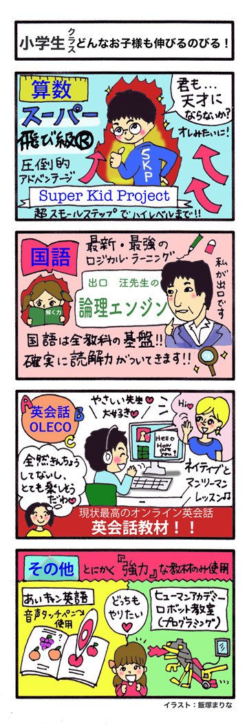 プロのイラストレーターの方に塾の宣伝4コマ漫画を描いていただきました。 その②「小学生クラス」です。 どれも自信を持っておすすめ出来る教材と指導法です。 算数 圧倒的アドバンテージ! 超スモールステップであっという間に自信が生まれ、しっかり自...