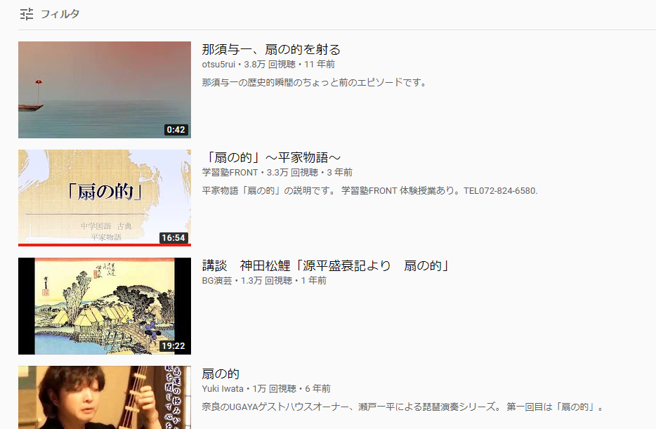自塾の生徒さん用に作ったもので、ほんの一部だけYouTubeに公開しているのですが、少し前に作った平家物語「扇の的」の解説動画が、「扇の的」で検索したら、いつの間にやら再生回数3.3万回以上で2位でした。びっくりぽんです^^ 塾生以外にはお見せ出...
