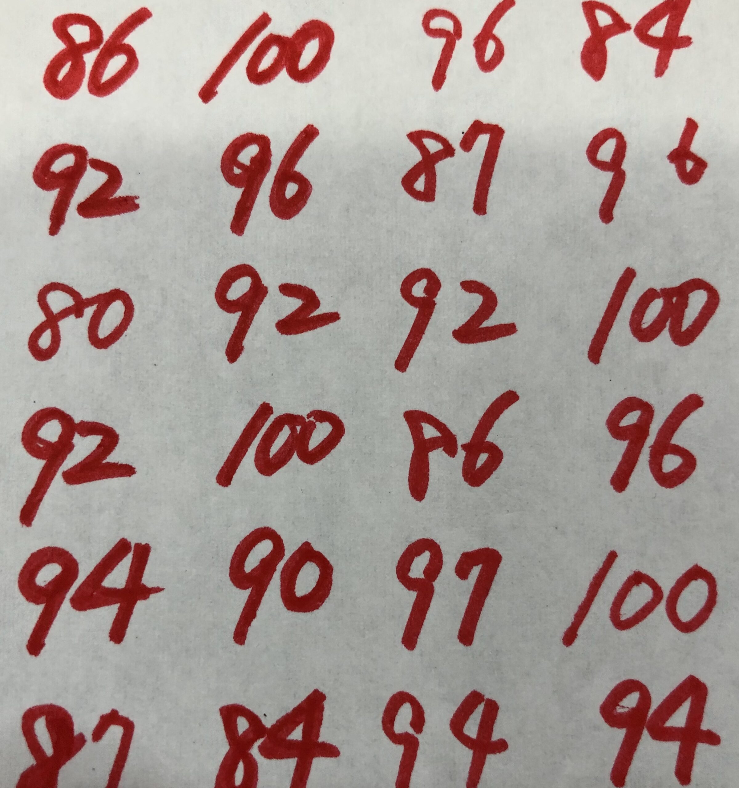 昨日、東香里校の中2さん7名が中間テスト結果(複数校・5教科・すべて100点満点換算)を見せてくれました。(※5/24のブログに書いたのは寝屋川校です。)結構よかったので80点以上のみを書き出してみました。嘘偽りない点数です。思わず、「すごいね・・・」とポロリと言ったら、皆さん笑顔も一瞬、自分の取り組みの問題点を口にしてとても悔しそうにしていました。ほめられたことではなく、自分の結果を見てもらったことに対して「ありがとうございます。」と、そそくさと席に戻って黙々と真剣に取り組んでいます。動きに無駄がない。初動が早い。やはり向上心のある生徒さんは違うなあと感心しました。しかし各々の課題をこちらもしっかり把握して次に活かすように指導して参ります。